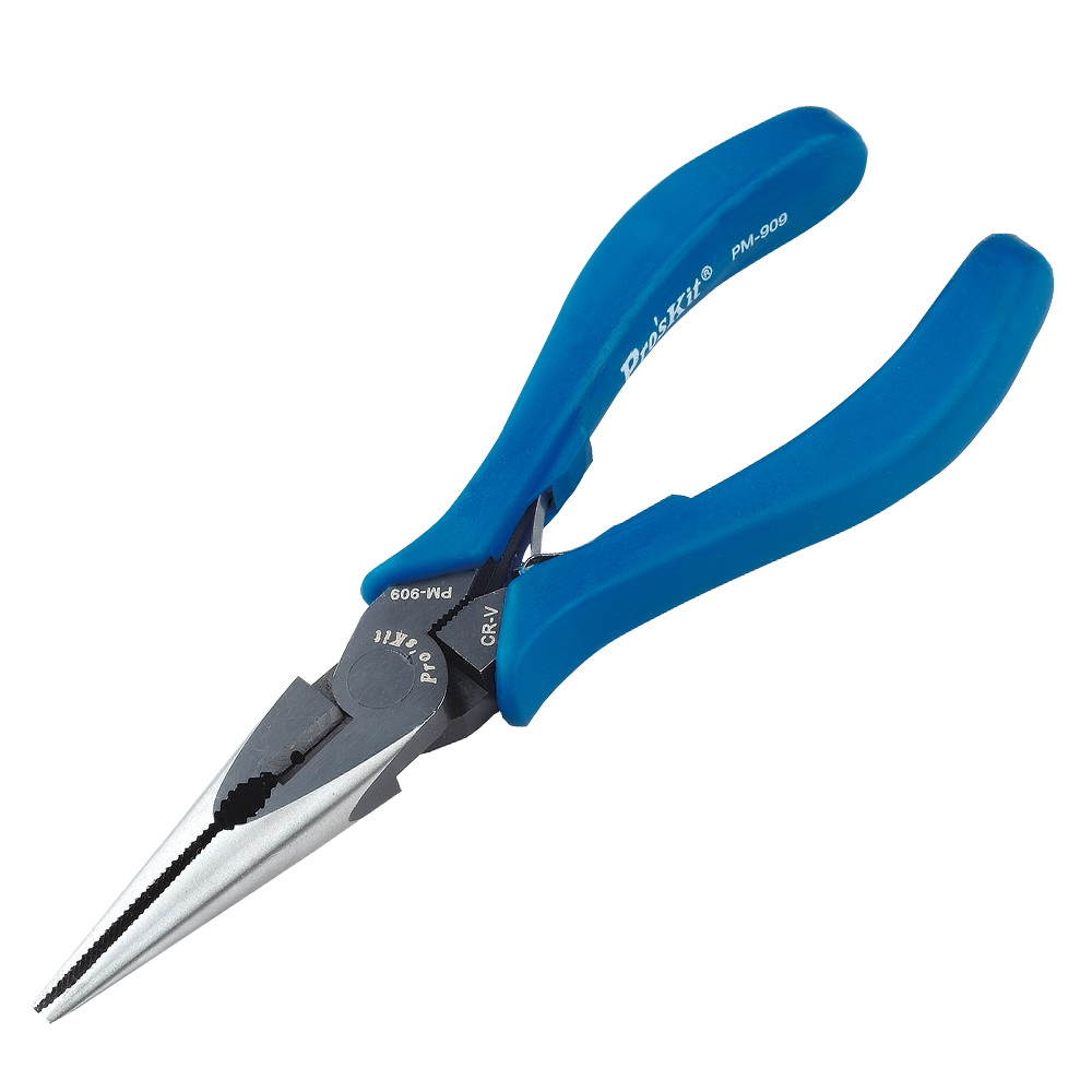 Pro'sKit PM-909 — длинногубцы (Long Nose Pliers) длиной 170 мм (6"), предназначенные для точных монтажных и ремонтных работ в электронике, электротехнике и сервисном обслуживании оборудования. Узкие удлинённые губки позволяют удобно захватывать, удерживать и сгибать мелкие детали, провода и компоненты в труднодоступных местах.