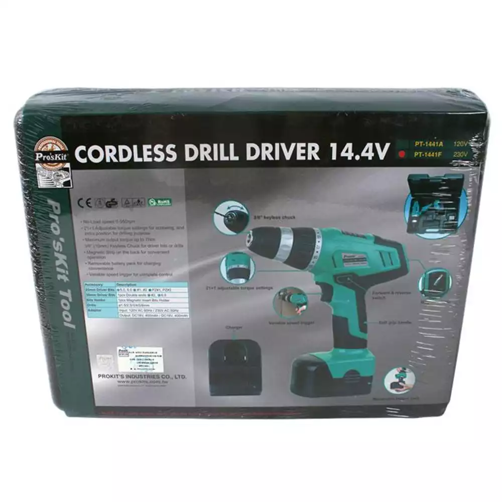 Pro'sKit PT-1441F — аккумуляторная дрель-шуруповерт 14.4 В, предназначенная для сверления и завинчивания крепежа при монтажных, ремонтных и сборочных работах. Компактная конструкция и удобное управление обеспечивают комфортную работу как в мастерской, так и в бытовых условиях.
