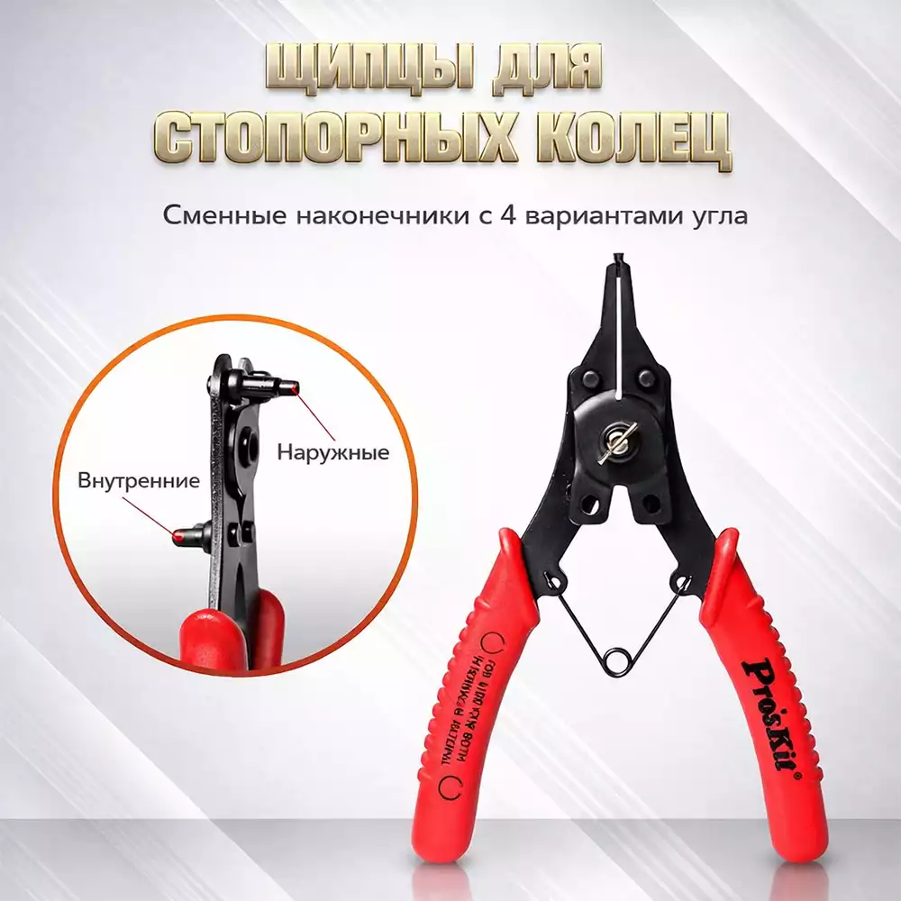 Pro'sKit 8PK-249 — универсальный набор для снятия стопорных колец, предназначенный для работы с внутренними и внешними кольцами. Инструмент обеспечивает удобный доступ и надежную фиксацию при монтаже и демонтаже стопорных колец.
