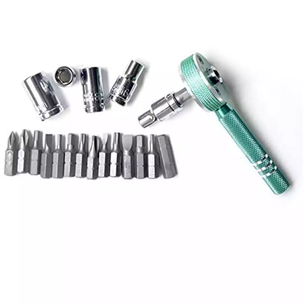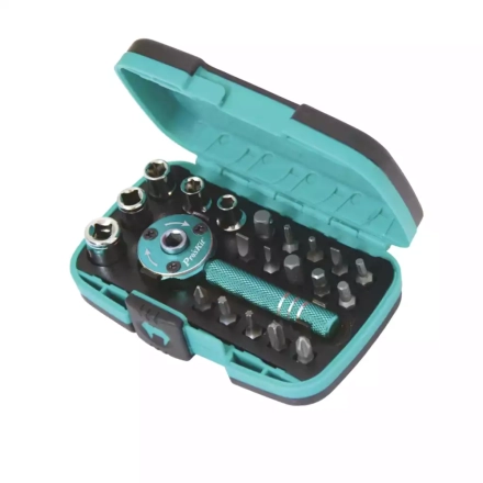 Pro'sKit SD-2319M — компактный набор с ручной трещоткой, включающий биты и торцевые головки, предназначенный для работы в ограниченном пространстве. Удобная конструкция позволяет быстро выполнять операции закручивания и откручивания крепежа.