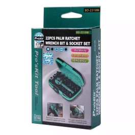 Pro'sKit SD-2319M — компактный набор с ручной трещоткой, включающий биты и торцевые головки, предназначенный для работы в ограниченном пространстве.