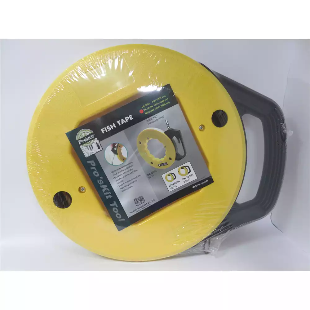 Pro'sKit DK-2033N — протяжка для кабеля длиной 100 ft (≈30,5 м), предназначенная для прокладки электрических проводов и кабелей через кабельные каналы, трубы и скрытые полости. Инструмент облегчает монтаж кабельных линий при электромонтажных и строительных работах.