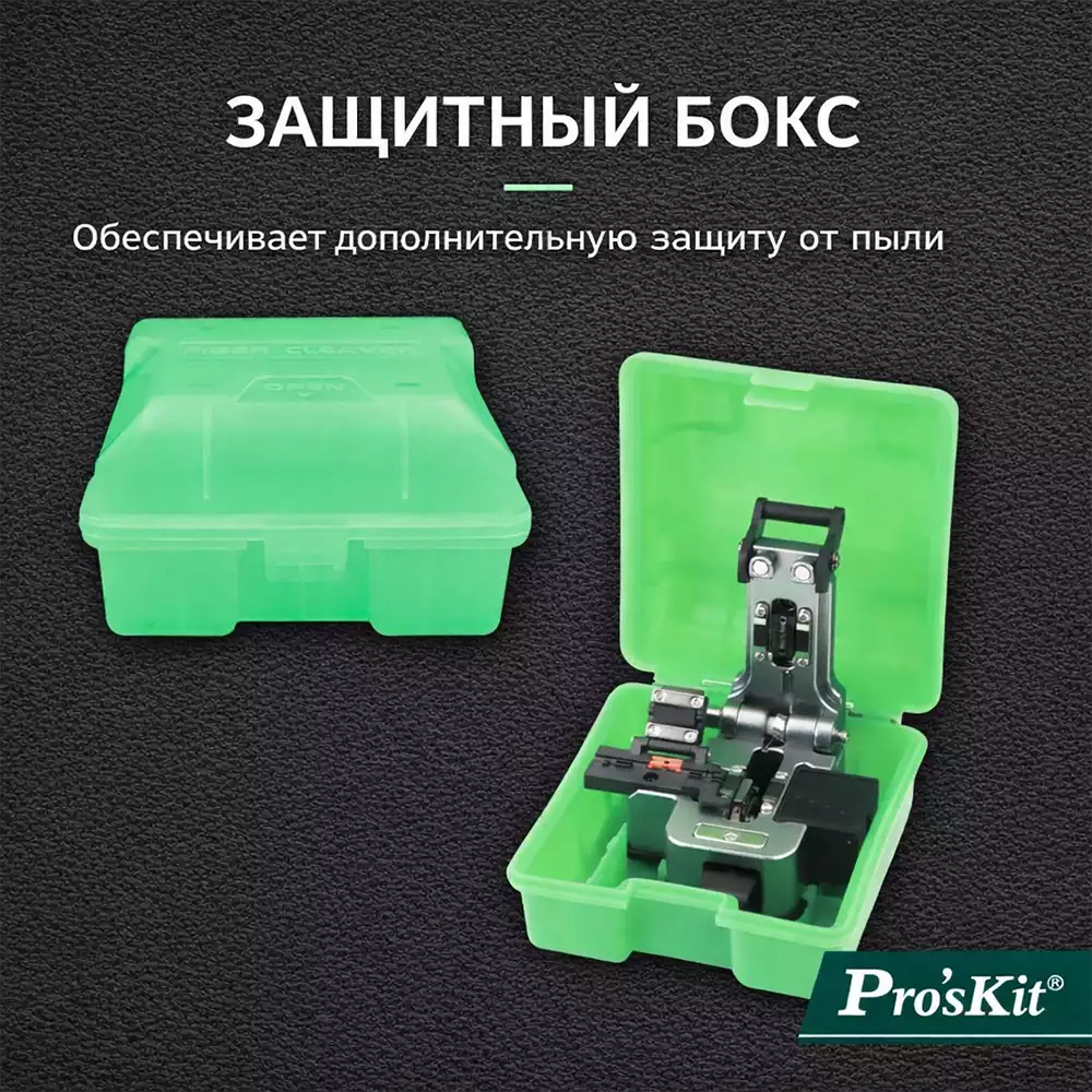 Pro'sKit FB-1688C — высокоточный скалыватель оптического волокна с контейнером для сбора отходов, предназначенный для подготовки волокон при монтаже и обслуживании оптических линий. Инструмент обеспечивает точный и чистый скол, необходимый для качественного соединения волокон.