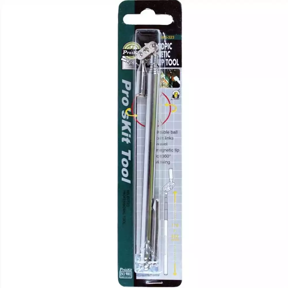 Pro'sKit MS-323 — магнитный захват с телескопической ручкой, предназначенный для извлечения металлических предметов из труднодоступных мест. Инструмент удобно использовать при ремонте оборудования, автомобилей и в мастерских.