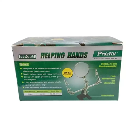 Pro'sKit 608-391A — это удобный держатель типа «третья рука», предназначенный для фиксации печатных плат и мелких компонентов при пайке, ремонте и сборке электроники. Инструмент оснащён увеличительной линзой, которая облегчает работу с мелкими деталями и повышает точность выполнения монтажных операций.