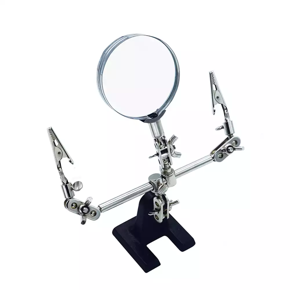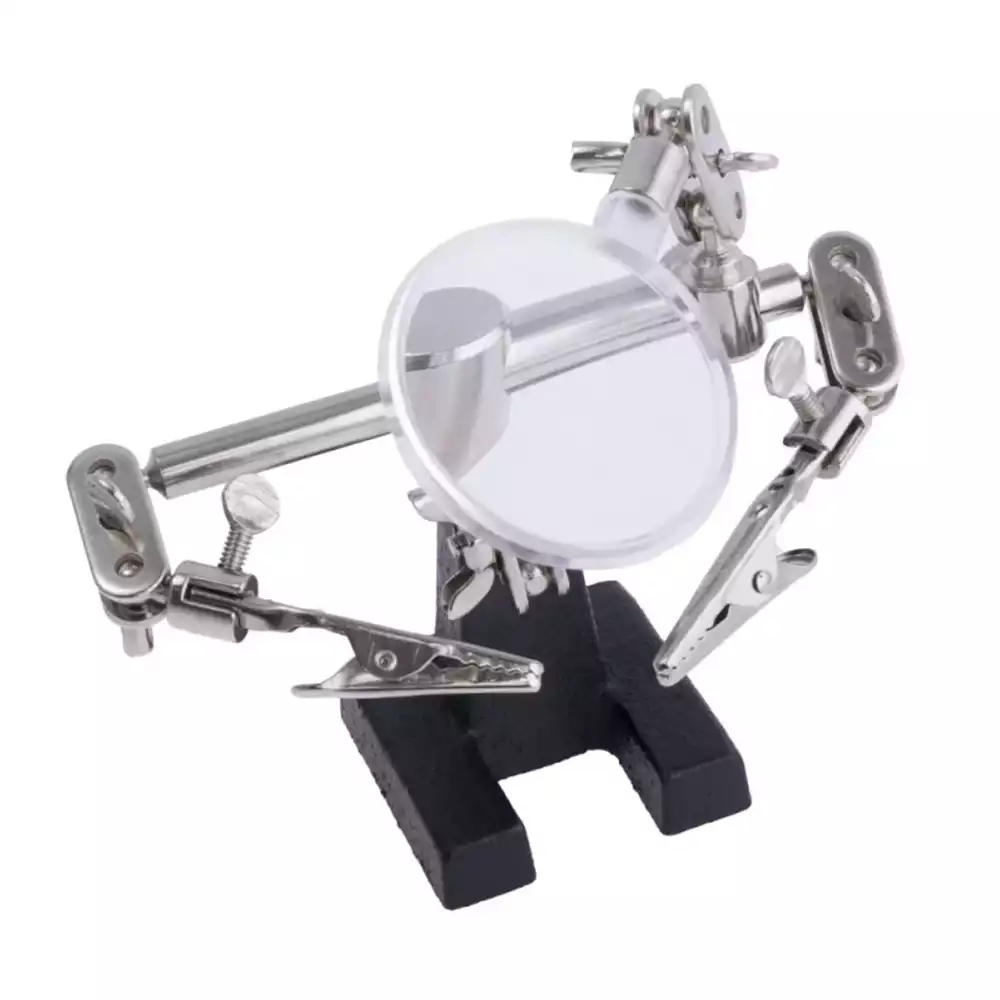 Конструкция включает две регулируемые гибкие стойки с зажимами-«крокодилами», позволяющими удерживать плату или компонент под нужным углом. Прочная металлическая база обеспечивает устойчивость, а увеличительная линза улучшает видимость при работе с миниатюрными элементами и дорожками печатных плат.