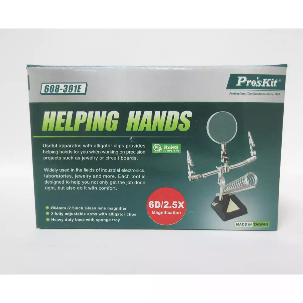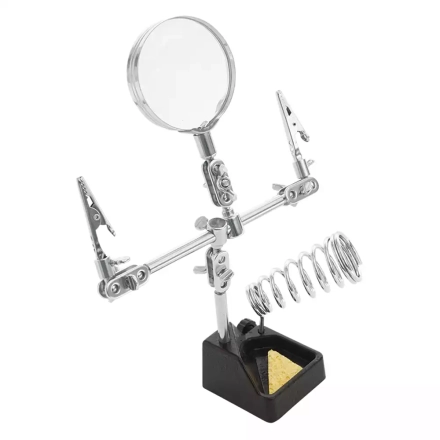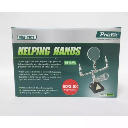 Pro'sKit 608-391E — это многофункциональный держатель типа «третья рука», предназначенный для фиксации печатных плат и мелких компонентов при пайке и ремонте электроники. Встроенная увеличительная линза облегчает работу с миниатюрными деталями и повышает точность выполнения монтажных операций.