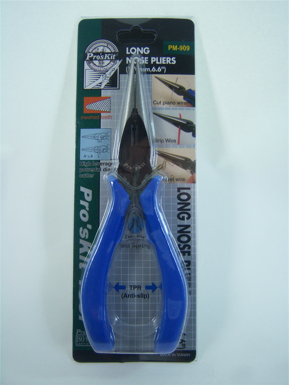 Pro'sKit PM-909 — длинногубцы (Long Nose Pliers) длиной 170 мм (6"), предназначенные для точных монтажных и ремонтных работ в электронике, электротехнике и сервисном обслуживании оборудования. Узкие удлинённые губки позволяют удобно захватывать, удерживать и сгибать мелкие детали, провода и компоненты в труднодоступных местах.