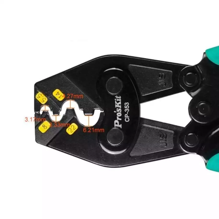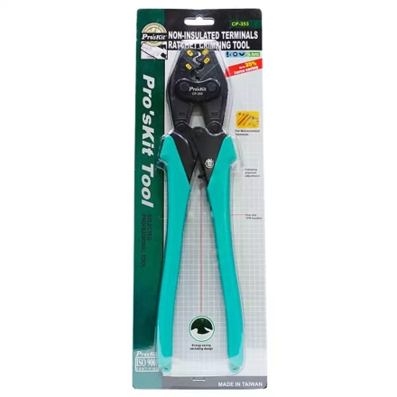 Пресс-клещи ProsKit CP-353 представляют собой инструмент высокого качества, предназначенный для обжима кольцевых и вилочных неизолированных наконечников. Эти клещи оснащены трещоточным механизмом, который обеспечивает надежное и удобное использование. С их помощью можно обжимать клеммы сечением от 4 до 25 мм², что делает их идеальным выбором для различных электромонтажных работ.