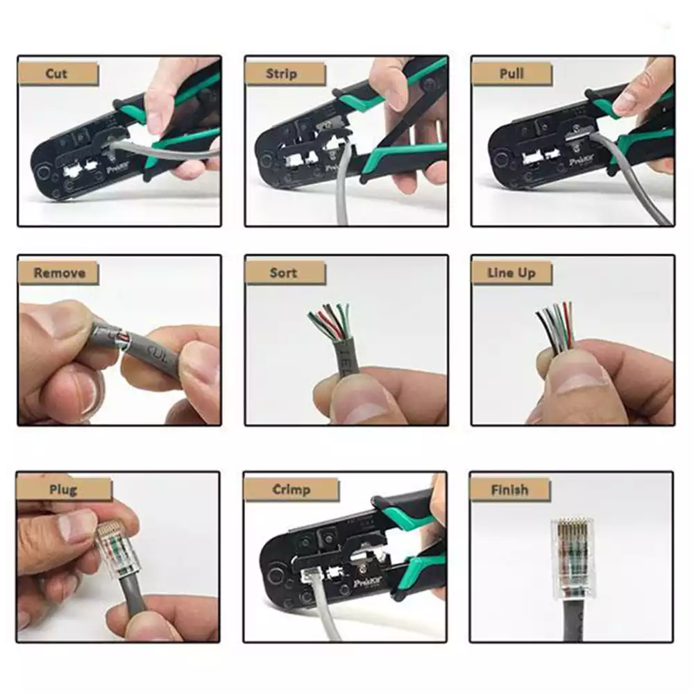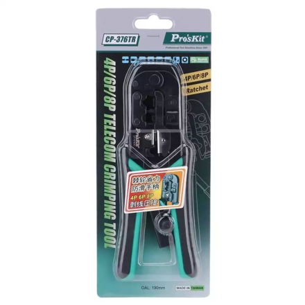 Пресс-клещи CP-376TR – это инструмент, предназначенный для обжима коннекторов типа P8C/RJ45, 6P2C/6P4C/6P6C RJ11/RJ12, RJ22 4P2C/4P4C, который широко используется в телекоммуникационных и сетевых работах. Эти клещи оснащены трещоточным механизмом, который обеспечивает равномерное давление при обжиме, что способствует надежности соединения.