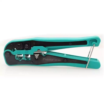 Пресс-клещи CP-393 от Pro'sKit представляют собой инструмент для обжима модульных разъемов типа RJ, включая RJ45, RJ22, RJ11, RJ12. Этот инструмент обладает зонами для различных размеров разъемов и включает в себя область для резки проводов, что делает его универсальным решением для подготовки кабельных соединений.