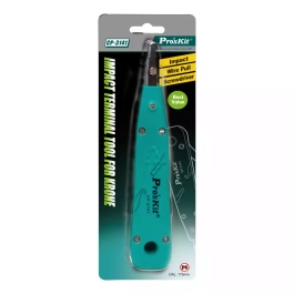 CP-3141 от компании ProsKit представляет собой ударный инструмент для врезки контактов типа КРОНЕ, который используется для установки и обслуживания телефонных и компьютерных сетей. Этот инструмент позволяет быстро и надежно укладывать провод в контакты, обеспечивая качественное соединение. С его помощью можно легко отсекать излишки провода, что делает процесс монтажа более аккуратным и эффективным.