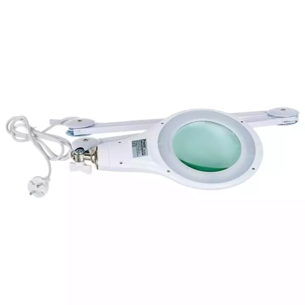 Лампа оснащена стеклянной увеличительной линзой диаметром 127 мм и обеспечивает увеличение в 5 диоптрий (2,25X), что делает её идеальной для работы с печатными платами, ювелирными изделиями, часами и другими мелкими деталями, требующими повышенной точности.
